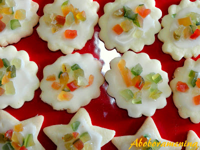 Depois de frios, banhe os biscoitos nesse glacê, coloque as frutas cristalizadas e deixe secar sobre uma grade.