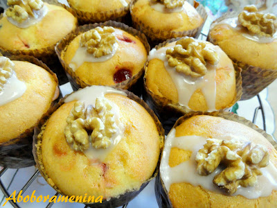 Fiz um glacê com 1/2 xícara de açúcar de confeiteiro e 1 colher (chá) de água e 1 colher (chá) de licor de chocolate branco e apliquei sobre os bolinhos, apenas para segurar as nozes.